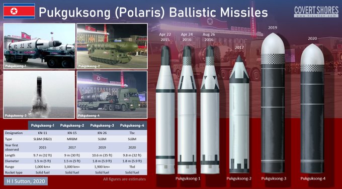 ▲ 북한의 북극성(1, 2, 3, 4형) 계열 잠수함발사탄도미사일(SLBM)의 제원. [HI Sutton 트위터 캡처]