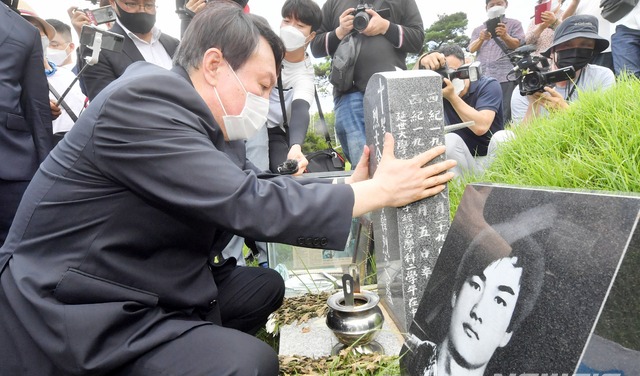 ▲ 국민의힘 윤석열 대선 경선후보가 지난 7월 17일 오전 광주 북구 민족민주열사묘역에 잠들어 있는 이한열 열사 묘지를 참배하고 있다. [뉴시스]