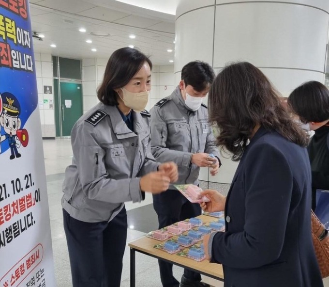▲ 경기 하남경찰서 경찰들이 20일 하남시 미사역 광장에서 스토킹처벌법 홍보용품을 시민들에 배포하고 있다. [하남경찰서 제공·뉴시스]