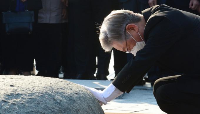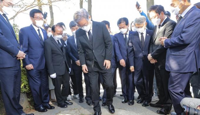 이 후보는 노 전 대통령 묘역이 있는 너럭바위 앞에서 무릎을 굽히고 바위에 손을 올려 묵념했다. 방명록에 "대통령님께서 열어주신 길을 따라 지금 여기까지 왔습니다. 그 길을 따라 끝까지 가겠습니다"라고 썼다.