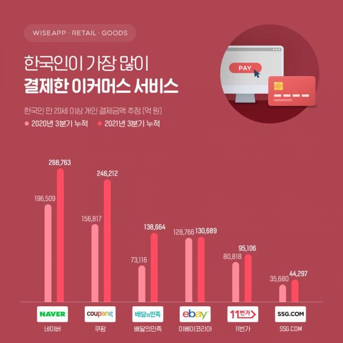25일 앱·리테일 분석서비스인 와이즈앱·리테일·굿즈가 만 20세 이상 한국인이 신용카드, 체크카드, 계좌이체 등으로 결제한 금액을 표본조사한 결과 올해 3분기까지 한국인이 가장 많이 결제한 이커머스 서비스는 네이버, 쿠팡, 배달의민족, 이베이코리아, 11번가, SSG닷컴 순으로 조사됐다고 밝혔다.