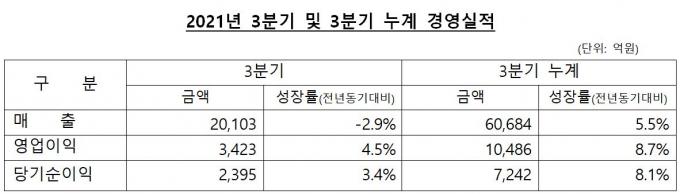3분기 누계 매출은 전년 동기 대비 3.8% 성장한 1조2105억 원, 영업이익은 0.4% 감소한 1712억 원을 실현했다.