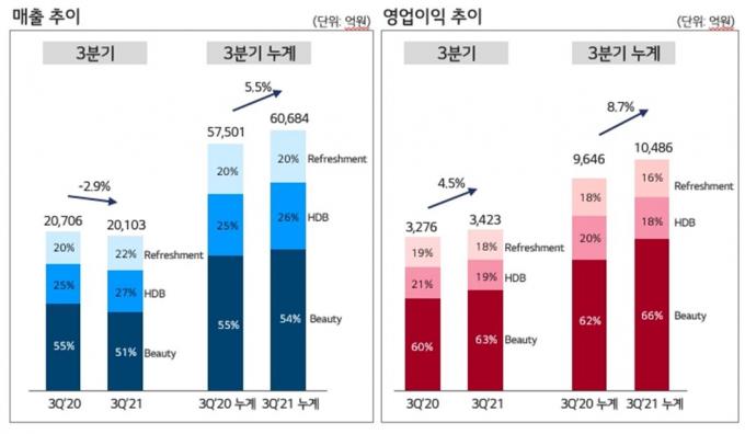 ▲ 2021년 3분기 및 누계 매출·영업이익 추이. [LG생활건강 제공]