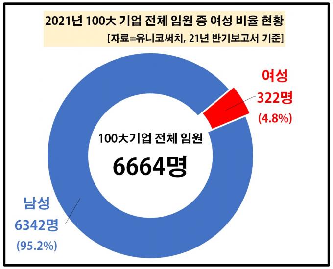 이 같은 결과는 글로벌 헤드헌팅 전문기업 유니코써치가 '2021년 국내 100대 기업 여성 임원 현황 조사' 결과에서 도출됐다고 27일 밝혔다. 조사 대상 100대 기업은 매출액 기준이고, 여성 임원은 올해 반기보고서에 나온 임원 현황 자료를 참고해 조사가 이뤄졌다. 임원은 사내이사와 미등기임원을 모두 포함한 기준이고, 사외이사는 조사에서 제외했다. 오너가도 조사에 포함됐다.