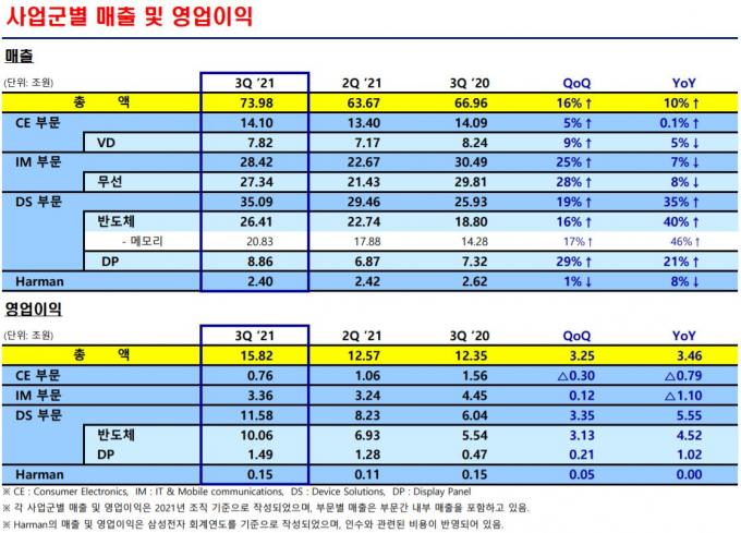삼성전자는 올 3분기 연결기준 매출 73조9800억 원, 영업이익 15조8200억 원을 각각 기록했다고 28일 밝혔다.