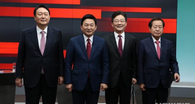▲국민의힘 대선 경선후보들이 지난 27일 강원도 춘천시 G1(강원민방) 방송국에서 합동 토론회에 앞서 포즈를 취하고 있다. 왼쪽부터 윤석열·원희룡·유승민·홍준표 후보 [뉴시스]