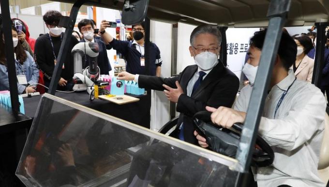 ▲더불어민주당 이재명 대선후보(가운데)가 28일 경기도 고양 킨텍스에서 열린 '2021 로보월드'에서 전시장을 둘러보고 있다. [뉴시스]