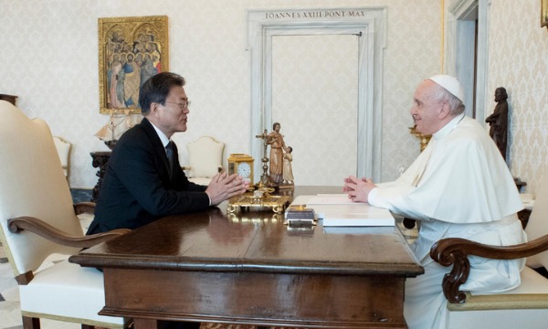 문 대통령은 29일(현지시간) 프란치스코 교황과 배석자 없는 단독 면담에서 "교황님께서 기회가 돼 북한을 방문해주신다면 한반도 평화의 모멘텀이 될 것"이라고 말했다고 박경미 청와대 대변인이 서면 브리핑을 통해 전했다.