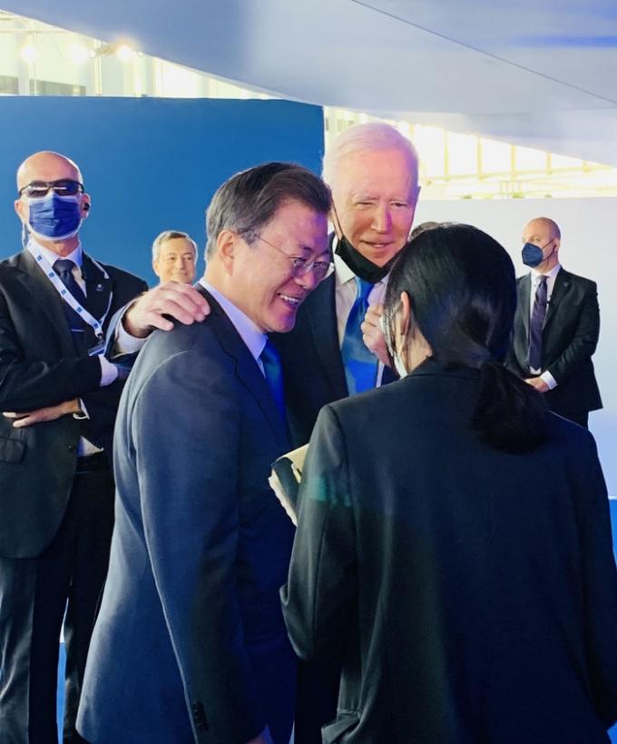 청와대 측은 "문 대통령은 회의장인 로마 누볼라 컨벤션센터에서 개막을 앞두고 다른 정상들과 기념사진 촬영을 하러 가기 전 정상 라운지에서 대기하던 중 바이든 대통령과 조우해 선 채로 2∼3분간 대화를 나눴다"고 설명했다.