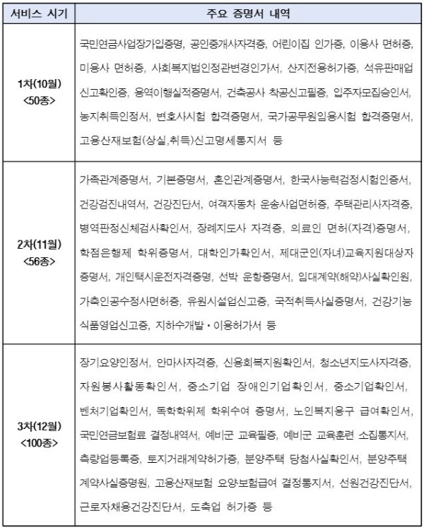11월엔 건강검진내역서, 가족관계증명서 등 56종을, 12월엔 중소기업·벤처기업 확인서, 자원봉사활동확인서, 청소년지도사자격증 등 100종을 추가 발급받을 수 있다.