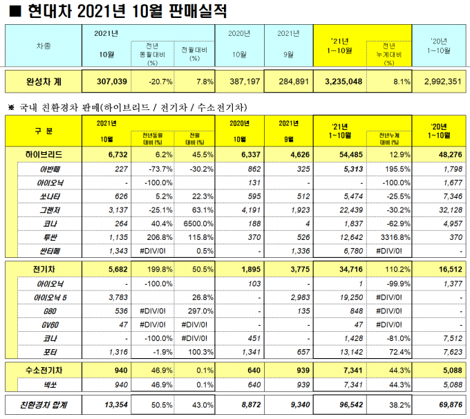 현대자동차는 2021년 10월 국내 5만7813대, 해외 24만 226대 등 전년 동월 대비 20.7% 감소한 30만7039대를 판매했다.