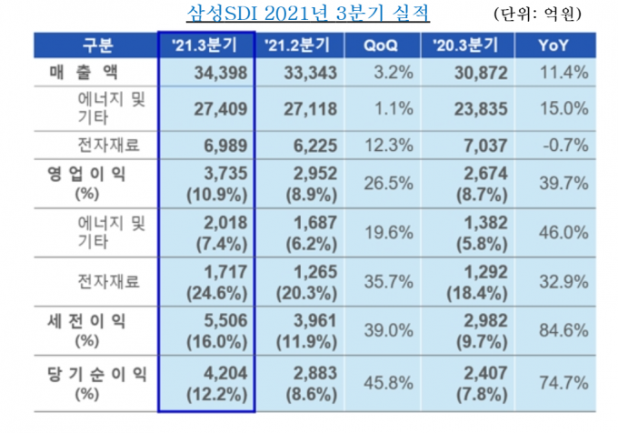 삼성SDI는 2일 진행된 3분기 실적 컨퍼런스콜에서 전년 동기 대비 매출은 3526억 원(11.4%) 증가했고 영업이익은 1061억 원(39.7%) 증가했다고 밝혔다.