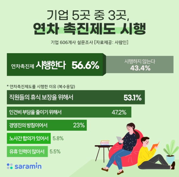 ▲ 인건비 부담을 줄이기 위해 국내 기업 절반 이상은 연차 촉진 제도를 시행하는 것으로 나타났다. [사람인 제공]