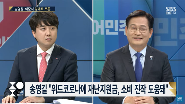 두 대표는 이날 오후 SBS '주영진의 뉴스브리핑'이 주관한 토론회에서 대권주자들과 관련한 문제를 놓고 공방을 벌였다. 토론의 첫 주제였던 '전국민 재난지원금 지급'에 대해 송 대표는 찬성, 이 대표는 반대 입장을 냈다.