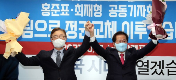 지난달 12일, 17일엔 2차 예비경선(컷오프)에서 탈락한 안상수 전 인천시장과 최재형 전 감사원장이 캠프에 합류했다. 안 전 시장은 1996년 홍 후보와 신한국당에 함께 입당했다. 공동 선대위장을 맡고 있다. 최 전 원장과는 정치적 인연보다 '도덕성' 등 가치 동맹의 관계다. 홍 후보는 최 전 원장 영입에 상당히 공들인 것으로 알려졌다.