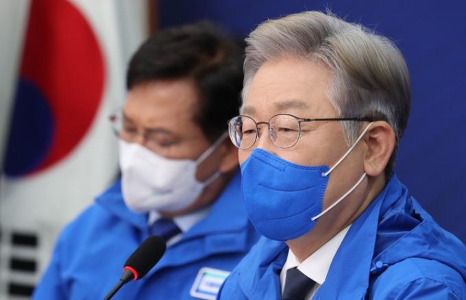 ▲더불어민주당 이재명 대선후보(오른쪽)가 지난 3일 서울 여의도 국회에서 열린 중앙선거대책위원회의에서 발언하고 있다. [뉴시스]