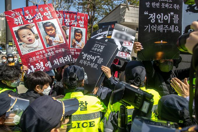 ▲ 정인양 양부모에 대한 1심 결심 공판에서 시민들이 강력한 처벌을 요구하는 시위를 하고 있다. [UPI뉴스]