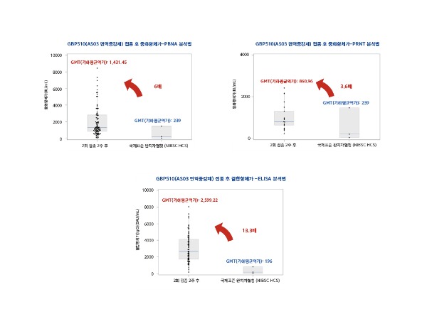 또 ELISA(효소결합면역흡착검사)를 통한 결과에서도 결합 항체가가 완치자 혈청 패널 대비 약 13.3배로 높았다. 일반적으로 면역 반응이 떨어지는 65세 이상의 고연령층을 포함했음에도 임상 1·2상 결과에서 높은 중화항체 유도 수준이 확인된 GBP510은 기존 코로나19 백신과 비교해 유사하거나 우수한 면역원성을 보여줬다.