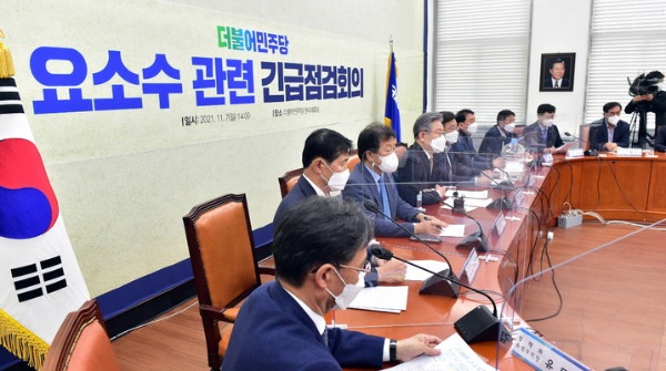 ▲ 7일 더불어민주당 이재명 대선 후보가 서울 여의도 국회에서 열린 요소수 관련 긴급점검회의에서 발언하고 있다.[뉴시스]