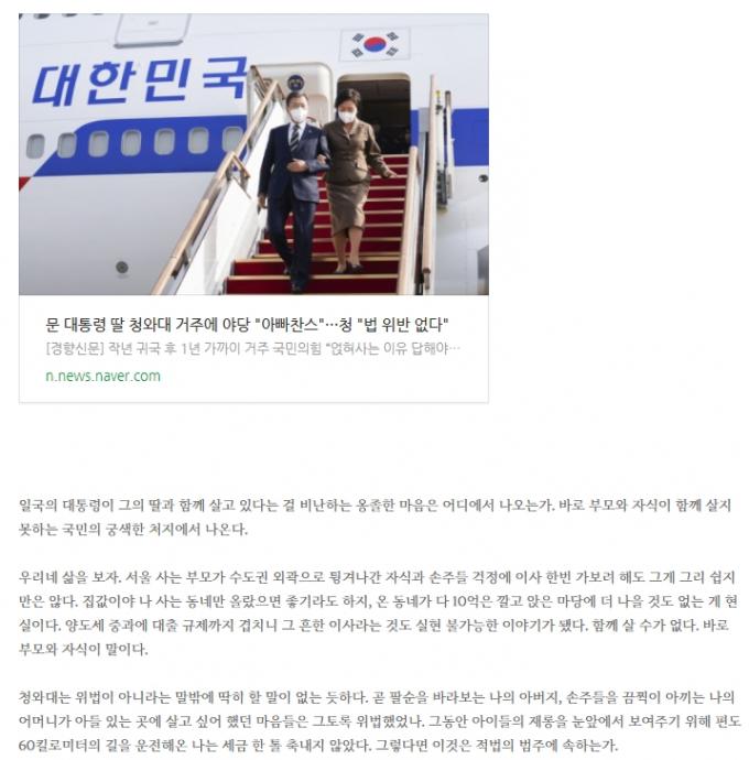 그는 "일국의 대통령이 그의 딸과 함께 살고 있다는 걸 비난하는 옹졸한 마음은 어디에서 나오는가"라며 "바로 부모와 자식이 함께 살지 못하는 국민의 궁색한 처지에서 나온다"고 짚었다. 이어 "서울 사는 부모가 수도권 외곽으로 튕겨나간 자식과 손주들 걱정에 이사 한 번 가보려 해도 그게 그리 쉽지만은 않다"며 "양도세 중과에 대출 규제까지 겹치니 그 흔한 이사라는 것도 실현 불가능한 이야기가 됐다"고 개탄했다.