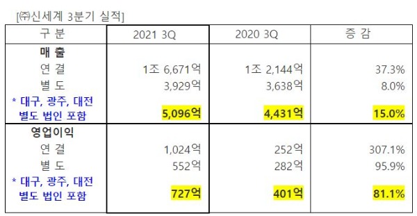 신세계는 올해 3분기 연결기준 매출 1조6671억 원, 영업이익 1024억 원을 각각 기록했다고 9일 공시했다. 전년 대비 매출액은 37.3% 증가했고, 영업이익은 3분기 최초로 1000억 원을 돌파했다.