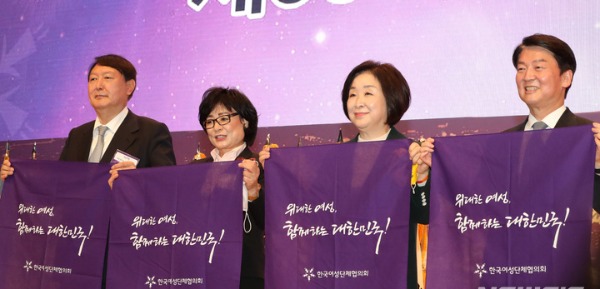 세 후보는 이날 서울 강남구 코엑스에서 열린 '제56회 전국여성대회'에 나란히 참석해 '여심 잡기' 경쟁을 벌였다.
