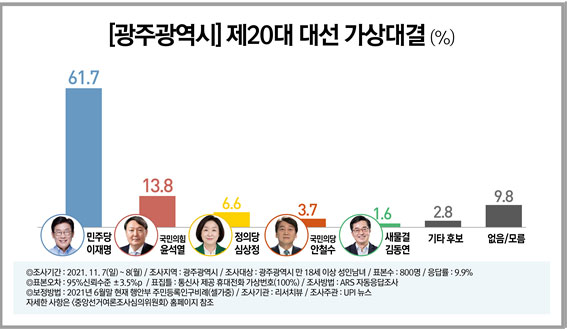 광주표심은 李 61.7%, 尹 13.8%…20대선 李 '반토막'
