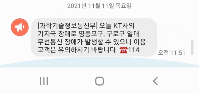 이에 과학기술정보통신부는 11시 50분께 "오늘 KT사의 기지국 장애로 영등포구, 구로구 일대 무선통신 장애가 발생할 수 있으니 이용 고객은 유의하시기 바란다"는 내용이 담긴 재난문자를 발송했다.