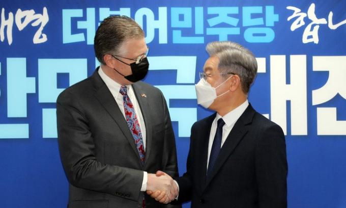 이 후보는 이날 오후 서울 여의도 중앙당사에서 대니얼 크리튼브링크 미국 국무부 동아시아·태평양 담당 차관보와 크리스토퍼 델 코소 주한미대사사관 대사대리를 접견했다. 그는 "오랜 한미동맹 관계를 통해 대한민국 민주주의와 경제가 세계적으로 인정받는 수준에 이른 것도 의미 있는 일"이라며 미국 정부의 지원과 협력에 대해 감사의 말을 전했다.