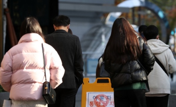 ▲11일 오전 서울 마포구 상암동 인근에서 시민들이 쌀쌀해진 날씨 탓에 주머니에 손을 넣고 이동하고 있다. [뉴시스]
