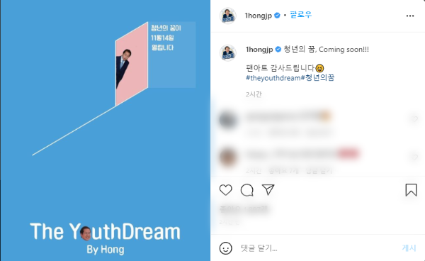 홍 의원은 12일 페이스북을 통해 "다시 텅 비우고 청년들의 광장으로 나간다"며 "이번주 일요일(14일) 청년 플랫폼 '청년의꿈'을 공개하고 업데이트해 이 땅의 청년들이 꿈과 희망을 공유하는 놀이터를 만들려고 한다"고 전했다. "저는 (플랫폼의) 수많은 코너 중 단지 청년상담소 코너에서 청년들의 고뇌, 고민, 미래에 대한 불안만 상담하는 곳만 들어갈 것이고 나머지는 정파를 떠나 자유롭게 교제하고 놀고 오락하고 즐기는 소신과 자유의 공간으로 만들어 보려고 한다"고 구체적인 계획도 제시했다.