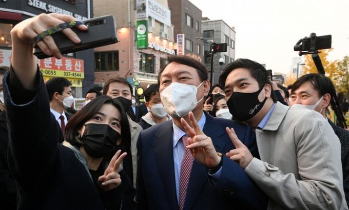 ▲ 국민의힘 윤석열 대선후보(가운데)가 11·5 전당대회 이틀 전인 지난 3일 서울 마포구 경의선숲길을 방문해 청년 지지자들과 기념촬영을 하고 있다. [뉴시스]