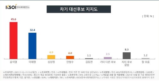 한길리서치(11~13일) 조사 결과도 비슷했다. 윤 후보는 44.4%, 이 후보는 35.9%를 얻었다. 부울경에선 윤 후보 55.9%, 이 후보 27.9%였다.