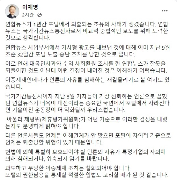 이 후보는 이날 오후 자신의 페이스북에 "연합뉴스가 1년간 포털에서 퇴출되는 초유의 사태가 생겼다"며 "포털의 권한남용을 통제할 적절한 입법도 고려할 때가 됐다"고 적었다.