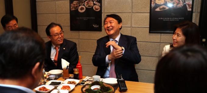 ▲ 국민의힘 윤석열 대선후보(가운데)가 16일 서울 여의도 한 식당에서 국민의힘 초재선 의원들과 오찬을 하고 있다. [뉴시스]