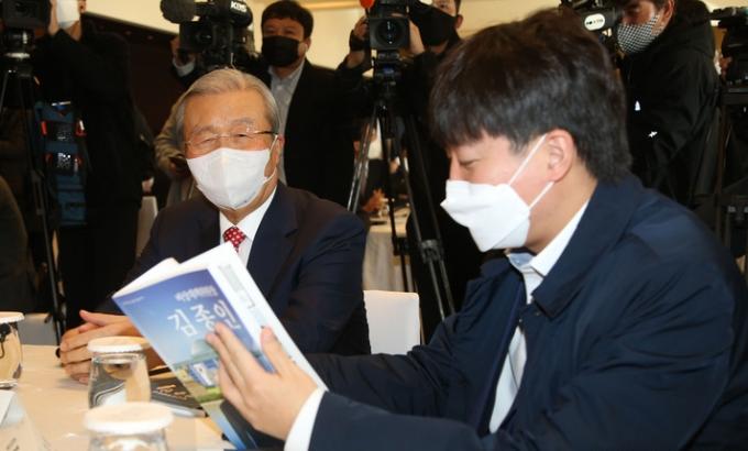 ▲ 국민의힘 이준석 대표(오른쪽)가 지난 15일 서울 용산구 그랜드 하얏트 서울 호텔에서 열린 만화로 읽는 오늘의 인물이야기 '비상대책위원장-김종인' 출판기념회에 참석해 김종인 전 비대위원장과 대화하고 있다. [뉴시스]