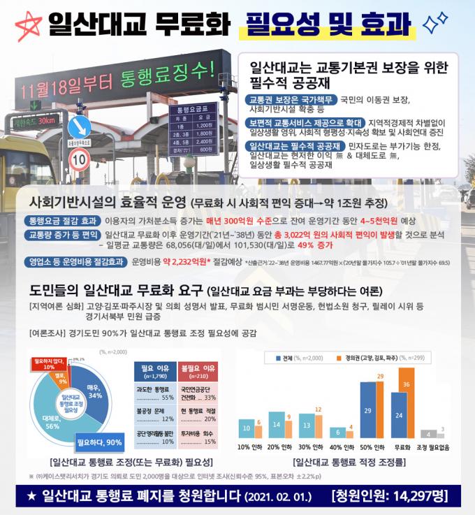 2017년 10월 '일산대교 통행료 인하 요청 또는 정확한 재무조사 요청'이란 제하의 국민청원을 시작으로 지난 2월에는 '일산대교 통행료 폐지' 청원이 제기됐다. 이 청원에는 1만4297명이 동의했다.