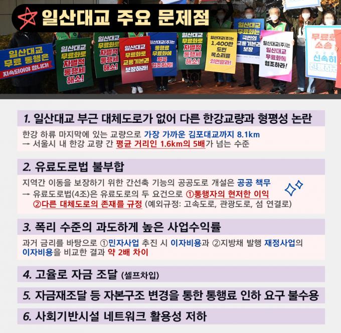 그러면서 "고양·일산·김포 등 경기북부 도민들은 1년 동안 약 60만 원의 통행료가 발생하고, 생계를 유지해야 되는 대형 차량의 경우 120만 원이 든다"며 "대체도로가 없을 경우 유료도로가 되지 않는데 일산대교에서는 (지난) 14년간 1년에 수백만 원의 통행료를 지역주민들이 부당하게 내고 있는 것"이라고 강조했다.