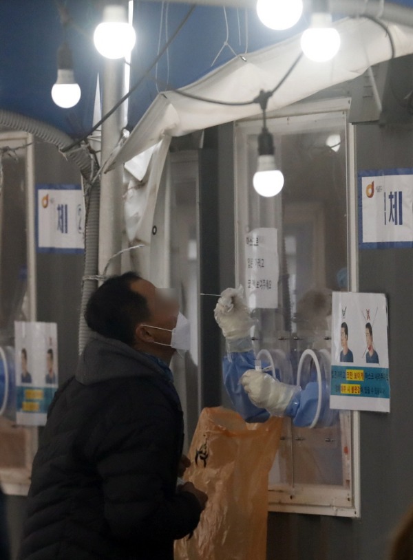▲ 19일 서울역 코로나19 임시선별검사소를 찾은 시민이 검사를 받고 있다.[뉴시스]
