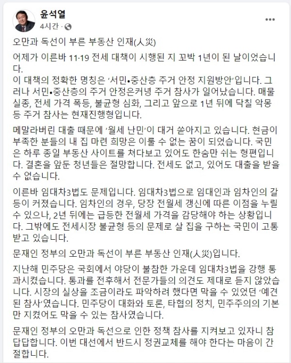 윤 후보는 20일 자신의 페이스북에 "어제가 이른바 11·19 전세 대책이 시행된 지 꼬박 1년이 된 날이었다. 이 대책의 정확한 명칭은 '서민·중산층 주거 안정 지원방안'이지만 서민·중산층의 주거 안정은커녕 주거 참사가 일어났다"고 적었다.
