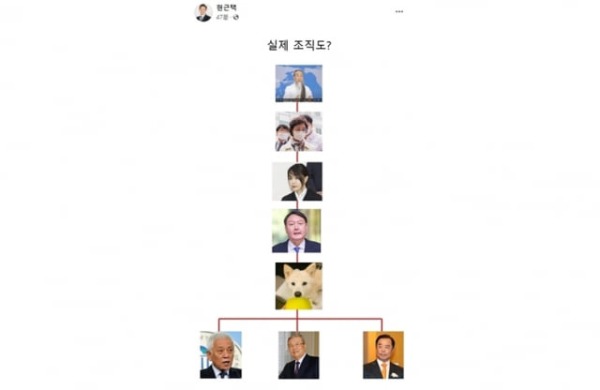 한준호 수행실장 등 캠프 관계자 잇단 설화 터져 이번엔 더불어민주당이 개 논란에 휩싸였다. 이재명 민주당 대선 후보 선대위의 현근택 대변인은 19일 오후 2시40분쯤 자신의 페이스북에 '실제 조직도'라며 윤 후보를 중심으로 한 가상의 '윤석열 선대위 조직도'를 올렸다.