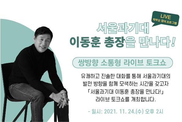 기업 선호·부모 신뢰·학생 양성 대학 도모 국립서울과학기술대학교(총장 이동훈, 이하 서울과기대)가 쌍방향 소통형 온라인 생방송 '서울과기대 이동훈 총장을 만나다!'를 24일 진행한다.