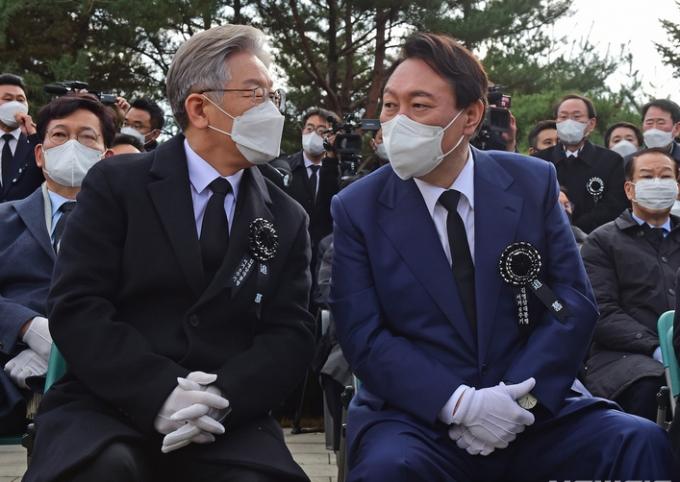 특히 여야 후보 4인은 추도식장 앞줄에 나란히 앉아 눈길을 끌었다. 윤 후보가 '동교동계' 권노갑 전 의원과 함께 묘역에 입장한 점도 주목을 받았다. 뒤이어 도착한 이 후보가 윤 후보에게 손을 내밀어 악수를 청하자 윤 후보는 웃으며 이 후보 왼쪽 팔을 가볍게 쳤다. 둘은 행사 전에 잠시 얘기를 주고받기도 했다. 이 후보가 윤 후보에게 말을 건넸고 윤 후보는 허리 숙여 경청하는 모습을 보였다.