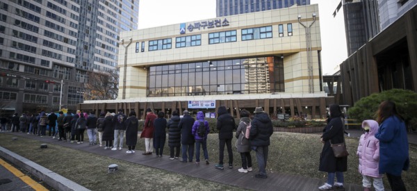 ▲ 지난 22일 오전 서울 송파구보건소에 설치된 코로나19 선별진료소를 찾은 시민들이 검사를 받기 위해 줄 서 있다. [뉴시스]