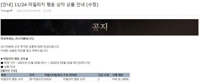 지난 24일 NC소프트는 '마일리지 행운상자'라는 패키지 상품을 출시했다. 해당 패키지는 낮은 확률이긴 하지만 평소 구하기 힘든 고급 아이템도 뽑을 수 있다는 것이 알려지며 핵과금 이용자들이 대량으로 구입하기 시작했다.
