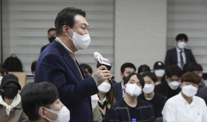 ▲ 국민의힘 윤석열 대선 후보가 지난 25일 저녁 서울 관악구 서울대학교 호암교수회관 게스트하우스 로즈홀에서 열린 '국민의힘 서울캠퍼스 총회'에서 인사말을 하고 있다. [뉴시스]