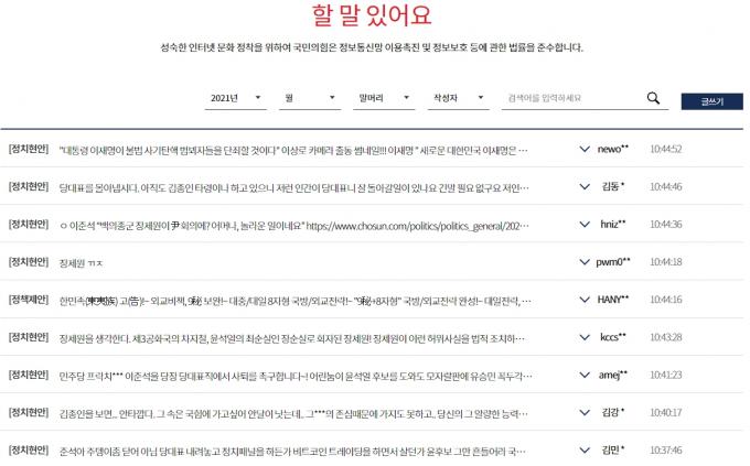 앞서 진중권 전 동양대 교수와 '조국 흑서' 저자 권경애 변호사는 김 전 위원장의 선대위 합류가 무산되자 장 의원을 배후 인물로 지목해 성토했다. 장 의원은 즉각 반격했다. 이날 국민의힘 홈페이지 '할 말 있어요' 게시판엔 이 대표와 김 전 위원장, 장 의원을 성토하는 글이 쏟아졌다.