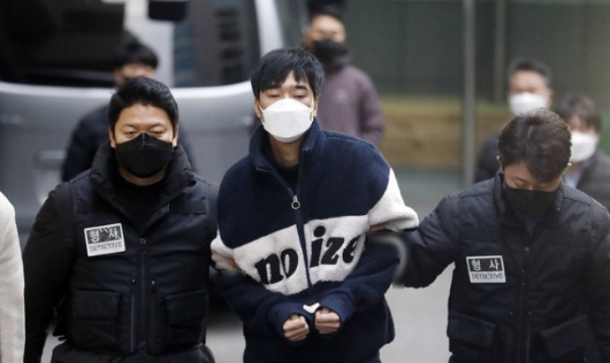 ▲ 전 여자친구를 스토킹 끝에 살해한 김병찬(가운데)이 29일 서울 남대문경찰서를 나서 호송차로 향하고 있다. [뉴시스]