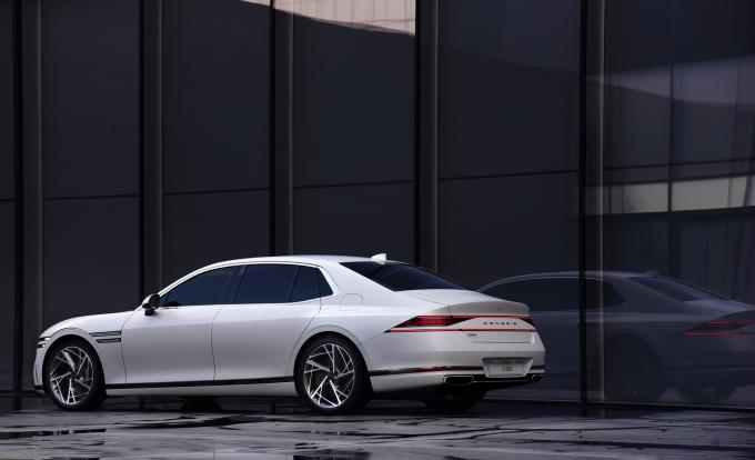 후면부는 제네시스 디자인의 핵심 요소인 두 줄의 리어 콤비램프가 트렁크를 따라 길게 이어져 있으며, 두 줄 사이에 제네시스 레터링 엠블럼을 간결하게 배치했다.