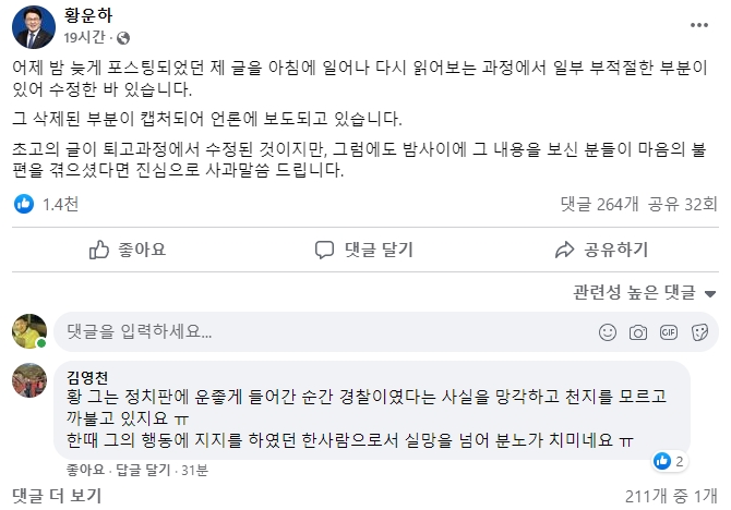 ▲ 민주당 황운하 의원 페이스북 캡처. 황 의원은 지난 28일 페이스북 글에서 국민의힘 윤석열 대선 후보를 공격했다가 지지자들을 비하했다는 지적을 받자 29일 사과 글을 올렸다. 28일 글은 논란이 된 부분을 빼고 수정 게시했다.